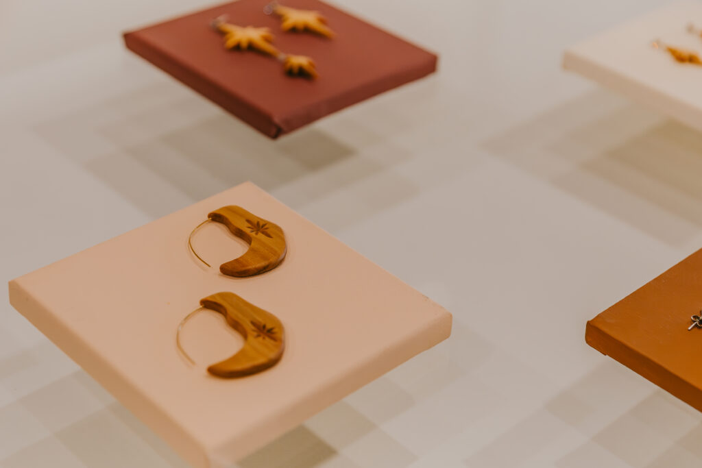 Ocupação do projeto Joias Biofílicas no Espaço Vitrine, que apresenta joias artesanais em madeira, criadas a partir do reaproveitamento de materiais e disponíveis para aquisição pelo público.